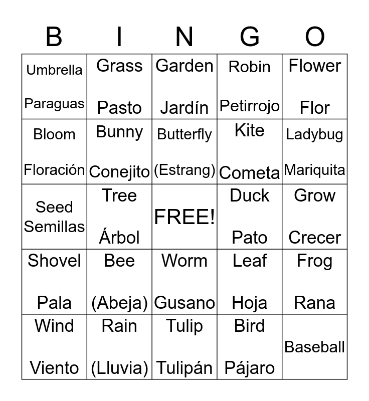 This bingo card has a free space and 24 words: Bee (Abeja), Rain (Lluvia), Butterfly (Estrang), Wind Viento, Flower Flor, Umbrella Paraguas, Bloom Floración, Grass Pasto, Duck Pato, Worm Gusano, Kite Cometa, Seed Semillas, Leaf Hoja, Frog Rana, Bunny Conejito, Bird Pájaro, Grow Crecer, Garden Jardín, Ladybug Mariquita, Tree Árbol, Baseball, Shovel Pala, Robin Petirrojo and Tulip Tulipán.