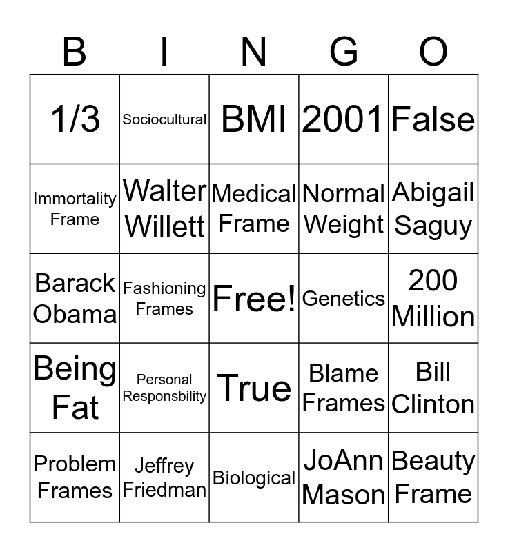 This bingo card has a free space and 29 words: Problem Frames, UCLA, Fashioning Frames, Fat Rights Frame, 1/3, BMI, Walter Willett, Personal Responsbility, Genetics, Jeffrey Friedman, 200 Million, Beauty Frame, Biological, JoAnn Mason, Abigail Saguy, 300 Million, True, Being Fat, False, Barack Obama, Blame Frames, Public Health Crisis Frame, Normal Weight, Immortality Frame, 2001, Sociocultural, Bill Clinton, Medical Frame and 1.5 Billion.