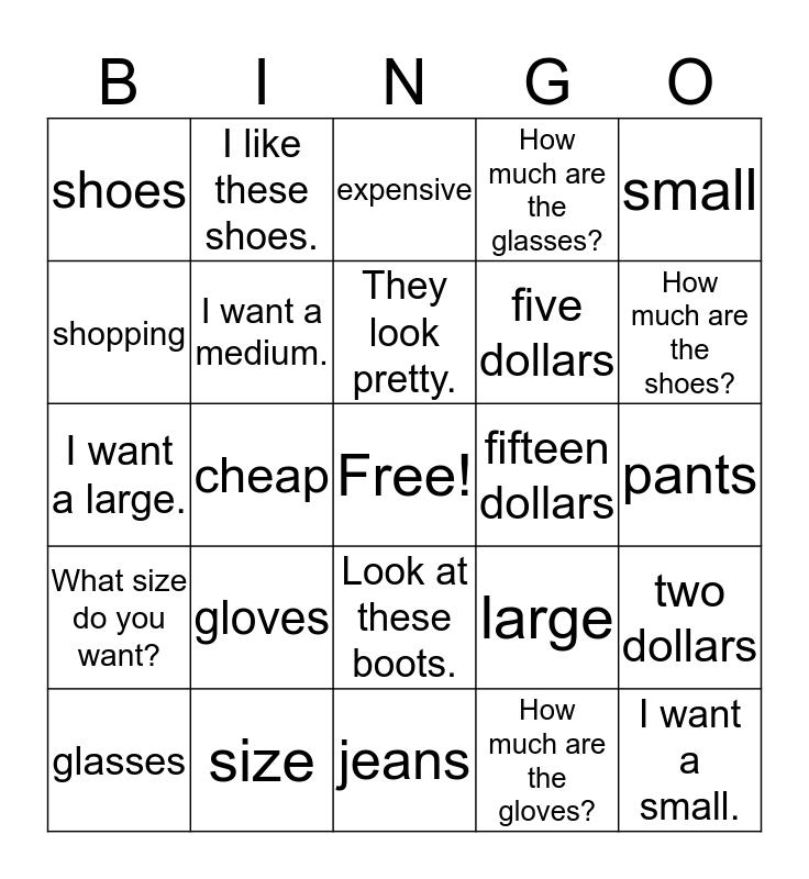 This bingo card has a free space and 29 words: glasses, medium, cheap, twenty dollars, shoes, expensive, I want a medium., gloves, fifteen dollars, size, pants, I want a small., jeans, How much are the gloves?, How much are the shoes?, eight dollars, Look at these boots., What size do you want?, small, I want a large., large, They look cool., five dollars, shopping, How much are the glasses?, I like these shoes., two dollars, They look pretty. and Let's buy some..