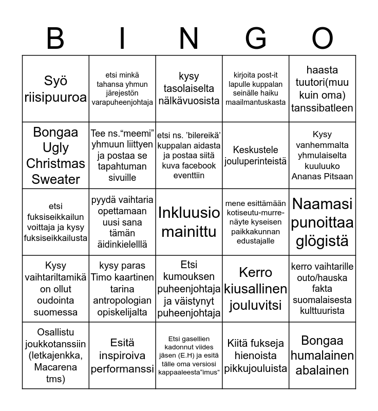 This bingo card has 55 words: käy kertomassa tuhma vitsi polhon puheenjohtajalle, Etsi kumouksen puheenjohtaja ja väistynyt puheenjohtaja, käy kertomassa vanhemmalle tieteenharjoittajalle maailmanpelastamisesta, haasta tuutori(muu kuin oma) tanssibatleen, ”Däbää” vanhemman opiskelijan edessä ja huuda “skrrt.” Lisäpiste jos däbäät toisen kerran ja huudat “lit!”, pyydä kumouksen logon suunnittelijan nimikirjoitus, etsi ns. ’bilereikä’ kuppalan aidasta ja postaa siitä kuva facebook eventtiin, etsi kuppalasta kuva tai maininta Thomas Hylland Eriksenistä, kerro vaihtarille outo/hauska fakta suomalaisesta kulttuurista, etsi kumouksen tietoturvavastaava ja kysy tältä tietoturvavinkkejä, etsi minkä tahansa yhmun järejestön varapuheenjohtaja, kysy speksistä speksiläiseltä, lausu runo ainejärjestölehden päätoimittajalle, mene kertomaan kekkosvitsi polholaiselle, keskustele valkoisen miehen taakasta kehitystutkijan kanssa, kysy paras Timo kaartinen tarina antropologian opiskelijalta, kysy tasolaiselta nälkävuosista, kirjoita post-it lapulle kuppalan seinälle haiku maailmantuskasta, etsi ännännen vuoden opiskelija ja kysy isosta pyörästä, etsi fuksiseikkailun voittaja ja kysy fuksiseikkailusta, pyydä vaihtaria opettamaan uusi sana tämän äidinkielelllä, juo shotti vapaavalintaista juomaa wanhan kanssa, mene esittämään kotiseutu-murre-näyte kyseisen paikkakunnan edustajalle, Kysy vanhemmalta yhmulaiselta kuuluuko Ananas Pitsaan, Ota selfie baarihenkilöstön kanssa ja postaa se tapahtuman sivuille (baarihenkilön luvalla), Tee ns.“meemi” yhmuun liittyen ja postaa se tapahtuman sivuille, Etsi gasellien kadonnut viides jäsen (E.H) ja esitä tälle oma versiosi kappaaleesta“imus”, Toista Kuppalan peilin edessä “kekkonen,kekkonen,kekkonen... jne.” ennen kello yhdeksää, Selitä vaihtarille mitä Sisu on, Kysy vaihtariltamikä on ollut oudointa suomessa, All I Want For Christmas soi, Esitä inspiroiva performanssi, Osallistu yhteislauluun, Koe liikuttava ystävyyden hetki uuden tuttavuuden kanssa, Naamasi punoittaa glögistä, Bongaa Ugly Christmas Sweater, Ota kuva hallituksen jäsenen kanssa, Inkluusio mainittu, Kerro kiusallinen jouluvitsi, Etsi kaksi kanssasi samassa kuussa syntynyttä, Syö riisipuuroa, Laula joulupotpuri, Ota kuva fuksin kanssa, Lähetä viesti Joulupukin Kuumalle linjalle, Bongaa poronsarvet, Osallistu joukkotanssiin (letkajenkka, Macarena tms), Todista jouluheilan metsästys livenä tai kännykän välityksellä, Ota jouluinen ryhmäselfie, Kiitä fukseja hienoista pikkujouluista, Bongaa humalainen abalainen, Etsi joku, jolla on sama lempi jouluelokuva, Todista herkkä hetki, Malja Abakukselle, Keskustele jouluperinteistä and “Onkos täällä kilttejä erkkoja?”.