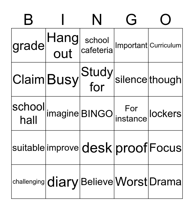 This bingo card has a free space and 46 words: Afternoon, Drama, probably, Believe, improve, Break, Hang out, Society, Claim, noise, Busy, Important, Focus, proof, Chore, Meal, Study for, For instance, scientific, Curriculum, imagine, Worst, grade, silence, sound, though, challenging, assignment, desk, suitable, catch up, choir, caretaker, detention, digital board, diary, lockers, notebook, Easter, (to) pass, principal, school cafeteria, school hall, timetable, extra curricular activities and get hurt.