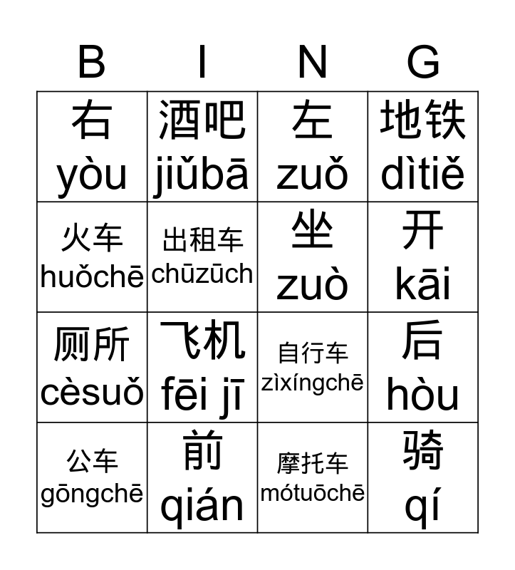 This bingo card has 16 words: 前 qián, 后 hòu, 左 zuǒ, 右 yòu, 厕所 cèsuǒ, 酒吧 jiǔbā, 自行车 zìxíngchē, 摩托车mótuōchē, 火车 huǒchē, 出租车chūzūch, 公车 gōngchē, 地铁 dìtiě, 飞机 fēi jī, 开 kāi, 坐 zuò and 骑 qí.