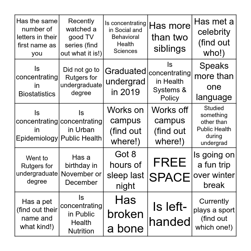 This bingo card has 25 words: Has a birthday in November or December, Has broken a bone, Graduated undergrad in 2019, Has a pet (find out their name and what kind!), Has met a celebrity (find out who!), Has the same number of letters in their first name as you, Is concentrating in Biostatistics, Recently watched a good TV series (find out what it is!), Works off campus (find out where!), Got 8 hours of sleep last night, Is concentrating in Health Systems & Policy, Is concentrating in Epidemiology, FREE SPACE, Is going on a fun trip over winter break, Did not go to Rutgers for undergraduate degree, Currently plays a sport (find out which one!), Studied something other than Public Health during undergrad, Is concentrating in Social and Behavioral Health Sciences, Speaks more than one language, Is concentrating in Urban Public Health, Works on campus (find out where!), Is concentrating in Public Health Nutrition, Went to Rutgers for undergraduate degree, Has more than two siblings and Is left-handed.