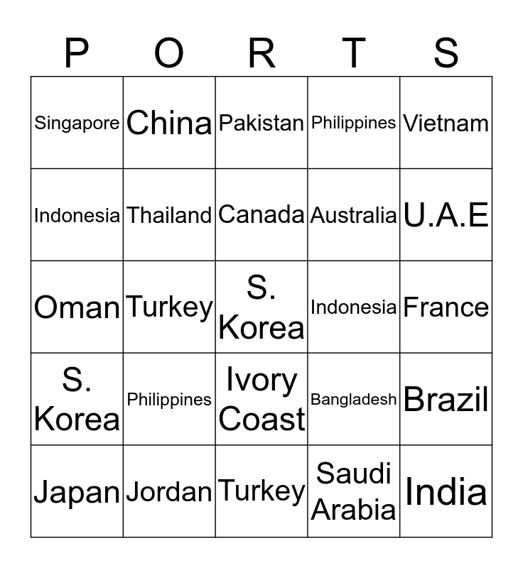 ⚠ This card has duplicate items: Spain (3), Italy (2), Germany (2), France (2), U.A.E. (2), Turkey (4), Saudi Arabia (3), Egypt (2), Vietnam (4), Thailand (2), Brazil (3), Taiwan (2), S. Korea (2), Philippines (2), Pakistan (2), Malaysia (3), Japan (5), Indonesia (6), India (2), China (10), Australia (4)