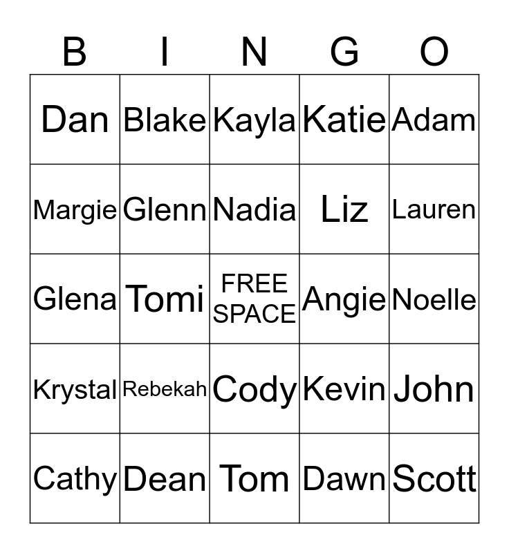 This bingo card has a free space and 24 words: Rebekah, Dean, Nadia, Cathy, Adam, Dan, Margie, Blake, Angie, Cody, Liz, Glena, Kevin, John, Glenn, Dawn, Noelle, Kayla, Lauren, Tomi, Scott, Krystal, Katie and Tom.