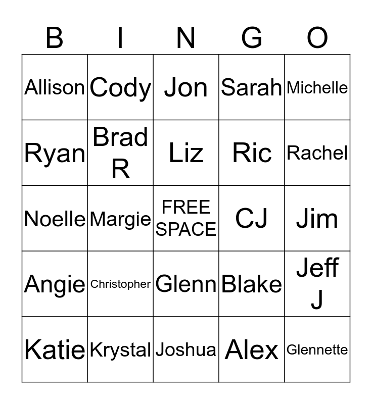 This bingo card has a free space and 24 words: Christopher, Krystal, Liz, Katie, Michelle, Allison, Ryan, Cody, CJ, Glenn, Ric, Noelle, Blake, Jeff J, Brad R, Alex, Jim, Jon, Rachel, Margie, Glennette, Angie, Sarah and Joshua.