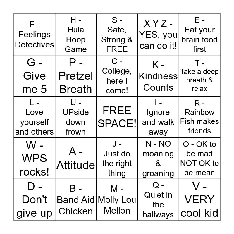 This bingo card has a free space and 24 words: A - Attitude, B - Band Aid Chicken, C - College, here I come!, D - Don't give up, E - Eat your brain food first, F - Feelings Detectives, G - Give me 5, H - Hula Hoop Game, I - Ignore and walk away, J - Just do the right thing, K - Kindness Counts, L - Love yourself and others, N - NO moaning & groaning, O - OK to be mad NOT OK to be mean, P - Pretzel Breath, Q - Quiet in the hallways, R - Rainbow Fish makes friends, S - Safe, Strong & FREE, T - Take a deep breath & relax, U - UPside down frown, V - VERY cool kid, W - WPS rocks!, X Y Z - YES, you can do it! and M - Molly Lou Mellon.