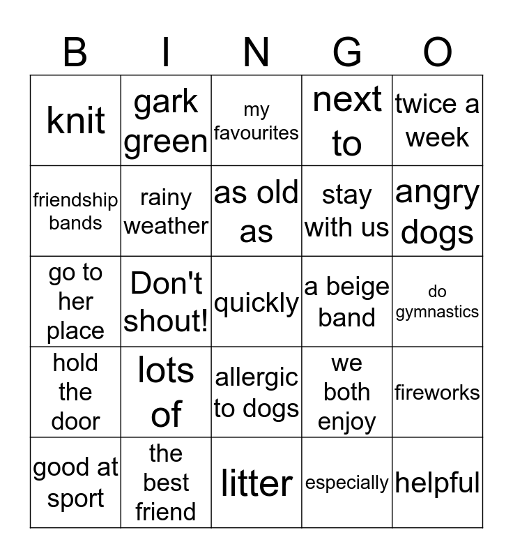 This bingo card has a free space and 24 words: lots of, the best friend, as old as, good at sport, twice a week, knit, friendship bands, gark green, a beige band, allergic to dogs, stay with us, go to her place, we both enjoy, fireworks, rainy weather, especially, do gymnastics, my favourites, angry dogs, Don't shout!, helpful, hold the door, next to and litter.