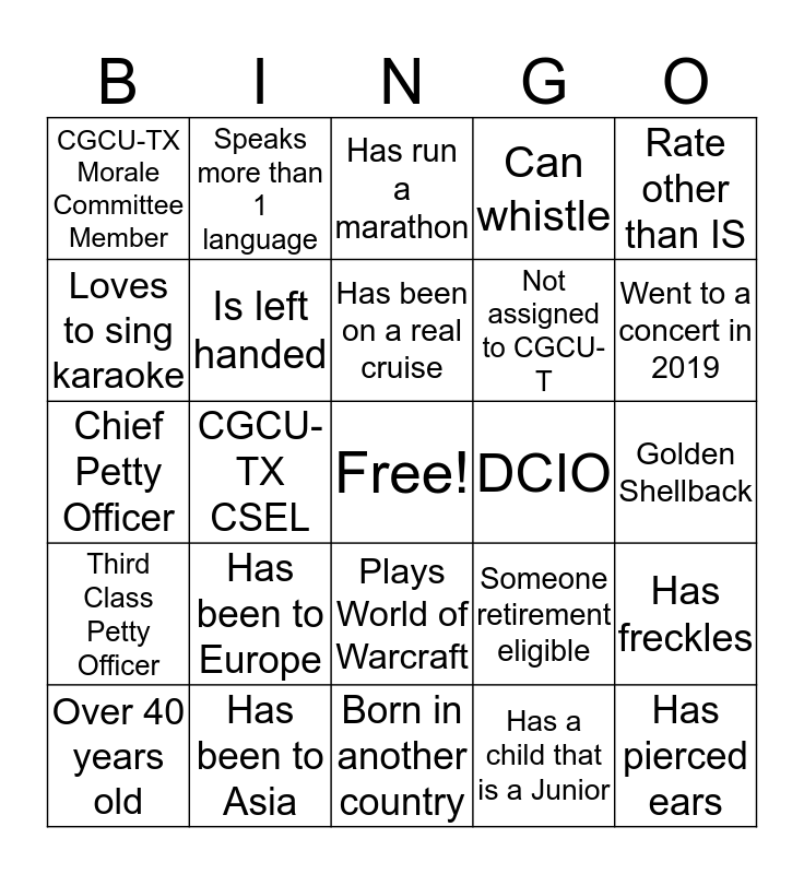 This bingo card has a free space and 50 words: Has a tattoo, Has pierced ears, Has never been on a real cruise, Born in another country, Has been to Europe, Doesn't drink coffee, Speaks more than 1 language, Has a birthday this month, Loves to sing karaoke, Under 21 years old, Is left handed, Can whistle, Has freckles, Someone retirement eligible, Is wearing a watch, Has more than 3 children, Has been on a real cruise, DCIO, Prior RD, Rate other than IS, CGCU-TX CSEL, Has a child that is a Junior, CGCU-TX Morale Committee Member, Not assigned to CGCU-T, BM, Wearing NIKE shoes, Went to a concert in 2019, Has more than 2 pets, Has run a marathon, Plays World of Warcraft, Plays guitar, Plays piano, Drinks Coffee, Has no tattoos, Has been to Asia, Shellback, Bluenose, Order of the Ditch, Golden Dragon, Golden Shellback, Academy Graduate, Drives a Ford, Has blond hair, Wears glasses, Over 40 years old, Chief Petty Officer, First Class Petty Officer, Second Class Petty Officer, Third Class Petty Officer and Junior Officer.