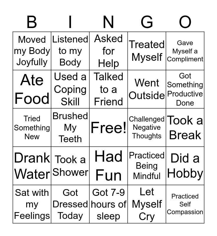 This bingo card has a free space and 24 words: Took a Shower, Got Dressed Today, Talked to a Friend, Sat with my Feelings, Gave Myself a Compliment, Moved my Body Joyfully, Ate Food, Listened to my Body, Challenged Negative Thoughts, Had Fun, Went Outside, Tried Something New, Practiced Being Mindful, Did a Hobby, Used a Coping Skill, Let Myself Cry, Took a Break, Asked for Help, Got Something Productive Done, Brushed My Teeth, Practiced Self Compassion, Drank Water, Treated Myself and Got 7-9 hours of sleep.