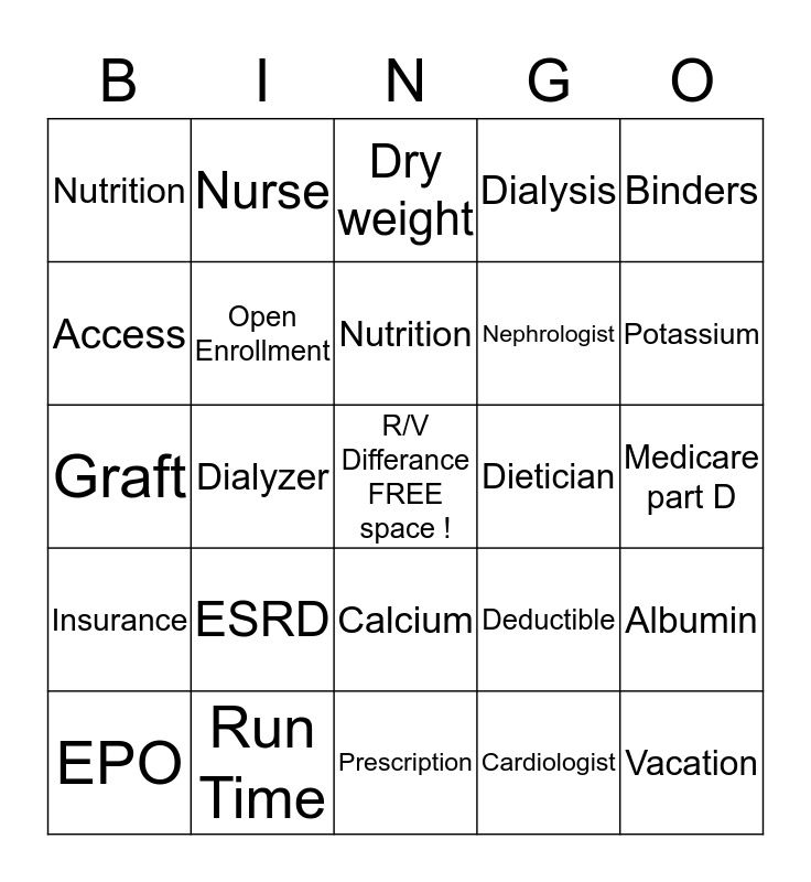 This bingo card has a free space and 24 words: ESRD, Run Time, Nutrition, EPO, Binders, Nutrition, Access, Nurse, Dietician, Calcium, Nephrologist, Graft, Deductible, Albumin, Open Enrollment, Cardiologist, Medicare part D, Dry weight, Potassium, Dialyzer, Vacation, Insurance, Dialysis and Prescription.