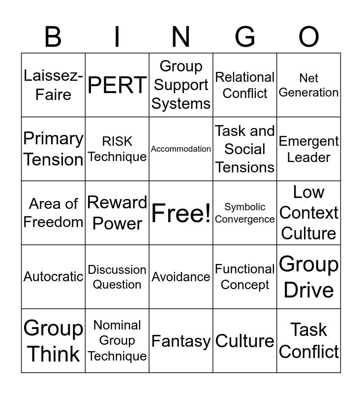 This bingo card has a free space and 24 words: Discussion Question, Nominal Group Technique, Accommodation, Group Think, Net Generation, Laissez-Faire, Primary Tension, PERT, Symbolic Convergence, Avoidance, Task and Social Tensions, Area of Freedom, Functional Concept, Group Drive, RISK Technique, Culture, Low Context Culture, Group Support Systems, Emergent Leader, Reward Power, Task Conflict, Autocratic, Relational Conflict and Fantasy.