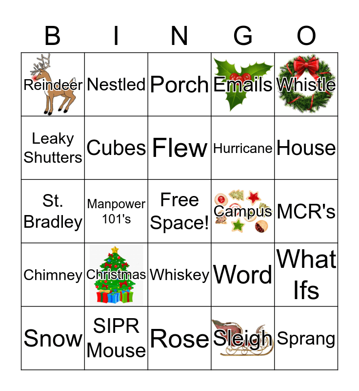This bingo card has 6 images, a free space and 24 words: Christmas, SIPR Mouse, Flew, Snow, Whistle, Reindeer, Leaky Shutters, Nestled, Campus, Whiskey, Hurricane, St. Bradley, Word, What Ifs, Cubes, Sleigh, MCR's, Porch, House, Manpower 101's, Sprang, Chimney, Emails and Rose.