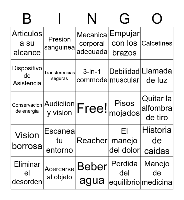 This bingo card has a free space and 27 words: El manejo del dolor, Zapatos apropiados, Debilidad muscular, Beber agua, Dispositivo de Asistencia, Mecanica corporal adecuada, Presion sanguinea, Vision borrosa, Pisos mojados, Historia de caidas, Conservacion de energia, Empujar con los brazos, Eliminar el desorden, Acercarse al objeto, Llamada de luz, Llamar por ayuda, Transferencias seguras, 3-in-1 commode, Escanea tu entorno, Articulos a su alcance, Quitar la alfombra de tiro, Perdida del equilibrio, Audiciion y vision, Manejo de medicina, Reacher, Calcetines and Freno de silla de ruedas.