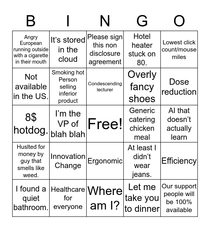 This bingo card has a free space and 24 words: Innovation Change, Healthcare for everyone, Condescending lecturer, I found a quiet bathroom., Lowest click count/mouse miles, Angry European running outside with a cigarette in their mouth, Not available in the US., It’s stored in the cloud, Generic catering chicken meal, Ergonomic, Overly fancy shoes, 8$ hotdog., At least I didn’t wear jeans., Efficiency, Smoking hot Person selling inferior product, Let me take you to dinner, AI that doesn’t actually learn, Please sign this non disclosure agreement, Dose reduction, I’m the VP of blah blah, Our support people will be 100% available, Huslted for money by guy that smells like weed., Hotel heater stuck on 80. and Where am I?.
