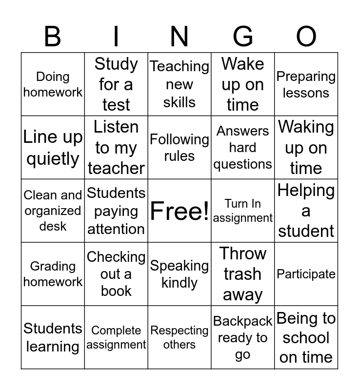 This bingo card has a free space and 29 words: Students learning, Reading and Math skills, Students paying attention, Asking for help, Doing homework, Teaching new skills, Listen to my teacher, Checking out a book, Turn In assignment, Complete assignment, Helping a student, Being to school on time, Respecting others, Backpack ready to go, Waking up on time, Expects a positive classroom, Speaking kindly, Grading homework, Preparing lessons, Clean and organized desk, Throw trash away, Clean out locker, Answers hard questions, Line up quietly, Wake up on time, Study for a test, Participate, Following rules and Getting enough sleep.