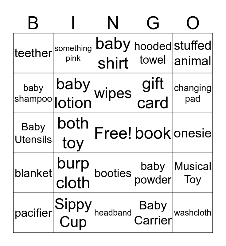 This bingo card has a free space and 39 words: bottle, mittens, rattle, baby lotion, pacifier, booties, wipes, bib, stuffed animal, blanket, both toy, hooded towel, washcloth, onesie, book, burp cloth, socks, teether, swaddle, baby powder, baby shampoo, headband, gift card, changing pad, diaper rash cream, hat, baby spoons, crib sheet, thermometer, something pink, something yellow, baby monitor, baby shirt, Sippy Cup, Baby Carrier, Clothing Set, Musical Toy, Baby Utensils and Photo Frame.