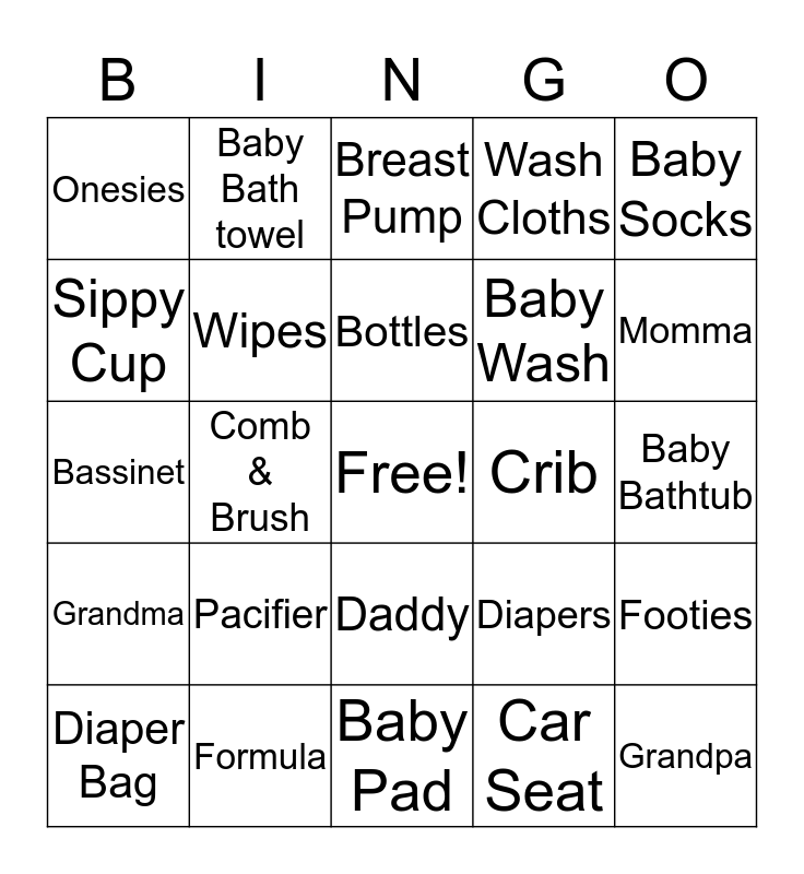 This bingo card has a free space and 24 words: Diaper Bag, Pacifier, Bottles, Car Seat, Baby Socks, Onesies, Baby Bath towel, Breast Pump, Crib, Baby Bathtub, Bassinet, Wipes, Diapers, Footies, Sippy Cup, Formula, Baby Pad, Wash Cloths, Momma, Grandma, Comb & Brush, Daddy, Baby Wash and Grandpa.