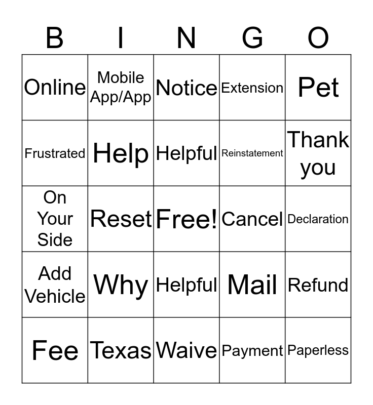 This bingo card has a free space and 36 words: Happy Holidays, Sings the NW jingle, Payment, Thank you, Add Vehicle, Texas, Helpful, Weather, Pet, NW.com, Reset, Notice, Mail, Paperless, On Your Side, Mobile App/App, Easy Pay, Extension, Refund, Online, Why, Helpful, Reinstatement, Cancelled, Fee, Help, Waive, Payment, Declaration, Frustrated, Christmas, Shopping, Cancel, Who, Remove and Add.