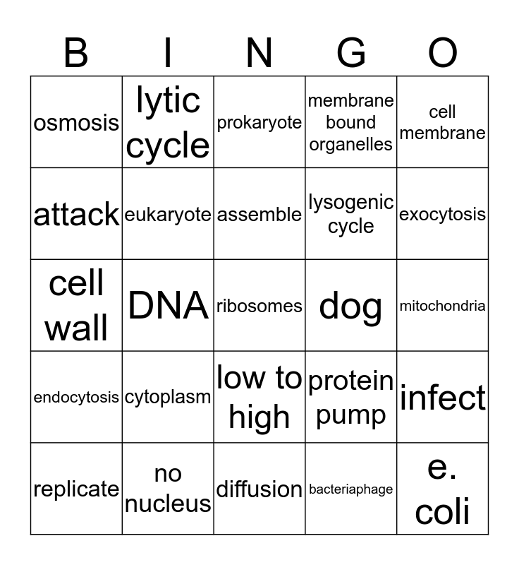 This bingo card has 30 words: no nucleus, nucleus, DNA, high to low, osmosis, prokaryote, eukaryote, low to high, dog, diffusion, mitochondria, ribosomes, bacteriaphage, e. coli, exocytosis, phospholipid bi layer, protein pump, endocytosis, cytoplasm, cell membrane, cell wall, chloroplasts, lytic cycle, lysogenic cycle, attack, membrane bound organelles, infect, replicate, assemble and destroy.