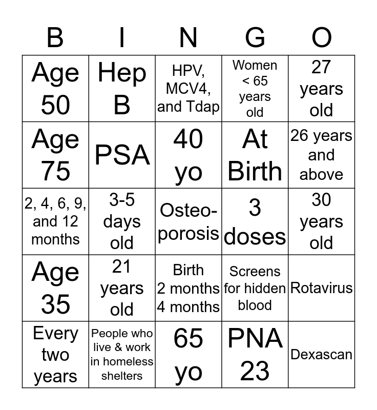 This bingo card has 25 words: 21 years old, 65 yo, 40 yo, Every two years, 27 years old, Age 50, Age 75, Hep B, 3 doses, Birth 2 months 4 months, At Birth, 2, 4, 6, 9, and 12 months, Screens for hidden blood, Rotavirus, PSA, Dexascan, 30 years old, HPV, MCV4, and Tdap, 26 years and above, 3-5 days old, Osteo-porosis, People who live & work in homeless shelters, Age 35, Women < 65 years old and PNA 23.