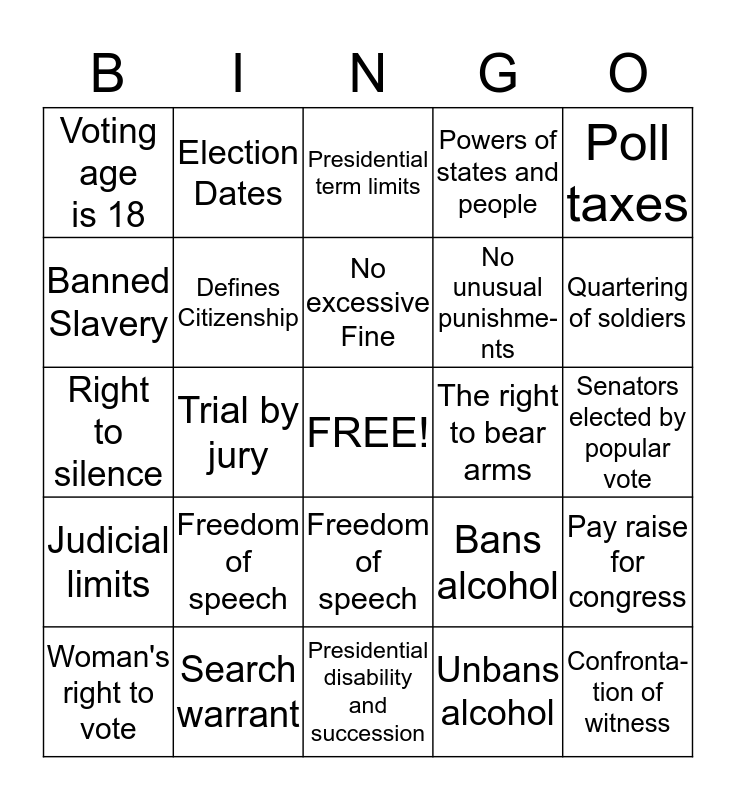 This bingo card has a free space and 24 words: Freedom of speech, Search warrant, No excessive Fine, Woman's right to vote, Poll taxes, Voting age is 18, Banned Slavery, Election Dates, The right to bear arms, Freedom of speech, No unusual punishme- nts, Right to silence, Bans alcohol, Pay raise for congress, Defines Citizenship, Unbans alcohol, Senators elected by popular vote, Presidential term limits, Quartering of soldiers, Trial by jury, Confronta- tion of witness, Judicial limits, Powers of states and people and Presidential disability and succession.