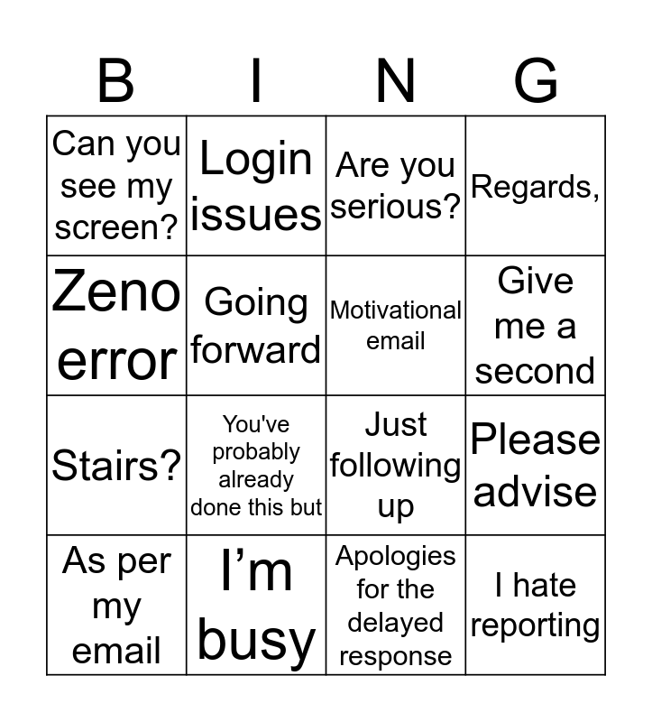 This bingo card has 16 words: As per my email, I’m busy, Are you serious?, Regards,, Zeno error, Login issues, Just following up, Please advise, Can you see my screen?, Going forward, Apologies for the delayed response, Give me a second, Stairs?, You've probably already done this but, Motivational email and I hate reporting.