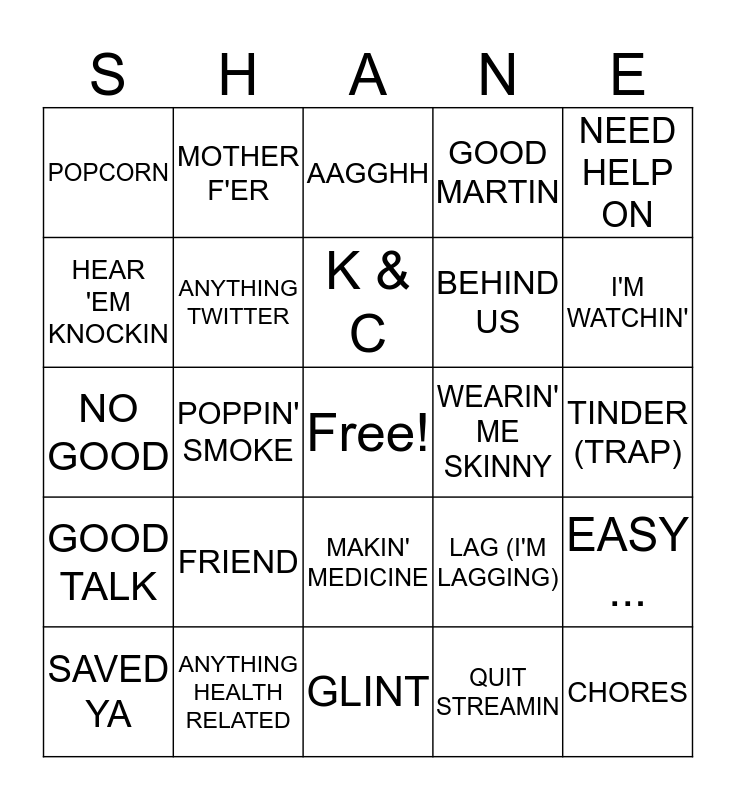 This bingo card has a free space and 34 words: HELP ME, QUIT STREAMIN, MP & 5 (MP & 7), BOOMER, GOOD TALK, ANYTHING TWITTER, NEED HELP ON, SAVED YA, MOTHER F'ER, @FACTS (FACT), K & C, AAGGHH, CAMPER, LETTIN' EM GET (A,B,C), WEARIN' ME SKINNY, I'M WATCHIN', ANYTHING HEALTH RELATED, NO GOOD, FRIEND, LAG (I'M LAGGING), MAKIN' MEDICINE, FOOD RELATED, POPCORN, TINDER (TRAP), GLINT, CHORES, GOOD MARTIN, BAD MARTIN, BEHIND US, HEAR 'EM KNOCKIN, FLASHIN' ME, POPPIN' SMOKE, EASY ... and NOT LAST.