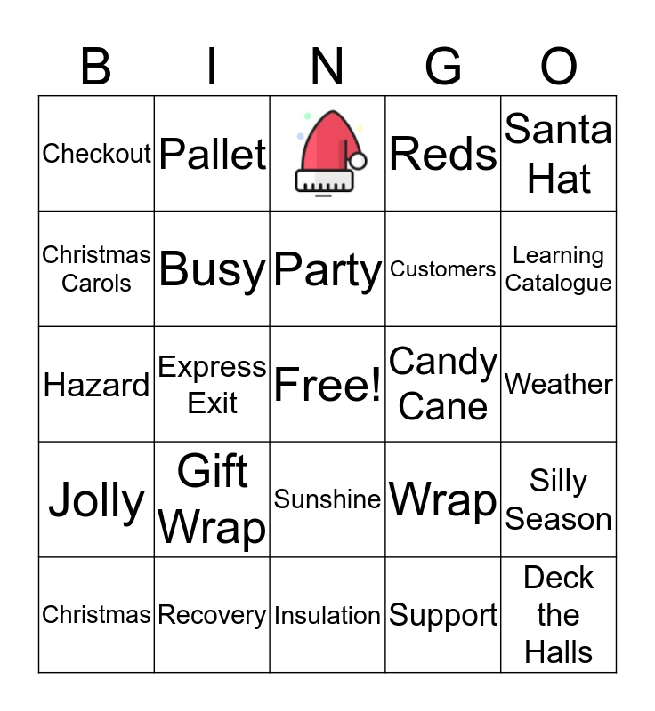 This bingo card has 5 images, a free space and 80 words: 5 keys, Annual Leave, Apron, BBQ, Beach, Best Service, Blackout, Busy, Candy Cane, Celebrate, Checkout, Christmas, Christmas Carols, Christmas Tree, Commercial, Consumer, Customers, Deck the Halls, Decorations, Express Exit, Family, Festive Lighting, Fixing, Gap Check, Gift Card, Gift Wrap, Gifts, Hammertime, Hazard, Holiday, Instagram, Insulation, Jingle Bells, Jolly, Learning Catalogue, Locker, Lowest Prices, Make it Yours!, Manual Handling, Margin, Mary, Meme, Mistletoe, Onions, Online, Pallet, Party, PowerPass, Presents, Project, Promo, Recovery, Reds, Reds App, Relaxation, Responsible, Safe Work Practices (SWP), Safety, Sales, Santa, Santa Hat, Sausage, Silly Season, Sober Driver, Social Media, Stock on Hand, Stocking, Summer, Sunny, Sunscreen, Sunshine, Support, Team, Top Stock, Turkey, Weather, Widest Range, Wine, Wrap and You did good!.