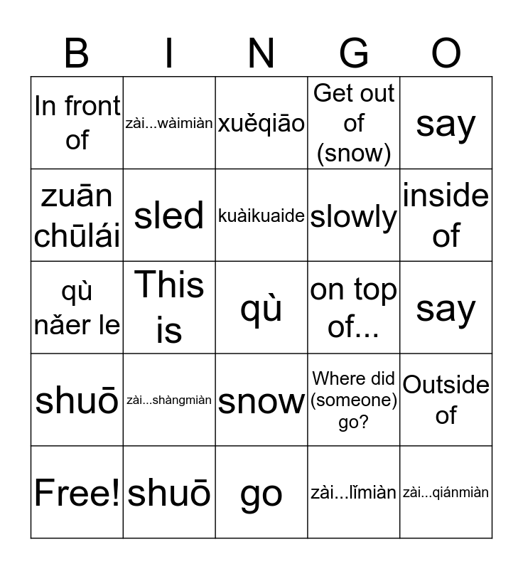 This bingo card has 29 words: Free!, zhèshì, This is, zài...qiánmiàn, In front of, xuěqiāo, sled, zài...shàngmiàn, on top of..., shuō, say, qù, go, zài...lǐmiàn, inside of, xuě, snow, shuō, say, qù nǎer le, Where did (someone) go?, mànmànde, slowly, zuān chūlái, Get out of (snow), zài...wàimiàn, Outside of, kuàikuaide and quickly.