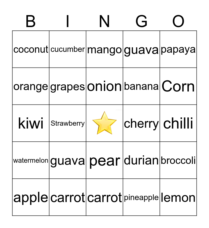 This bingo card has a free space and 24 words: guava, carrot, onion, apple, papaya, coconut, orange, cucumber, cherry, pear, banana, kiwi, durian, broccoli, grapes, pineapple, chilli, mango, Corn, Strawberry, lemon, watermelon, guava and carrot.