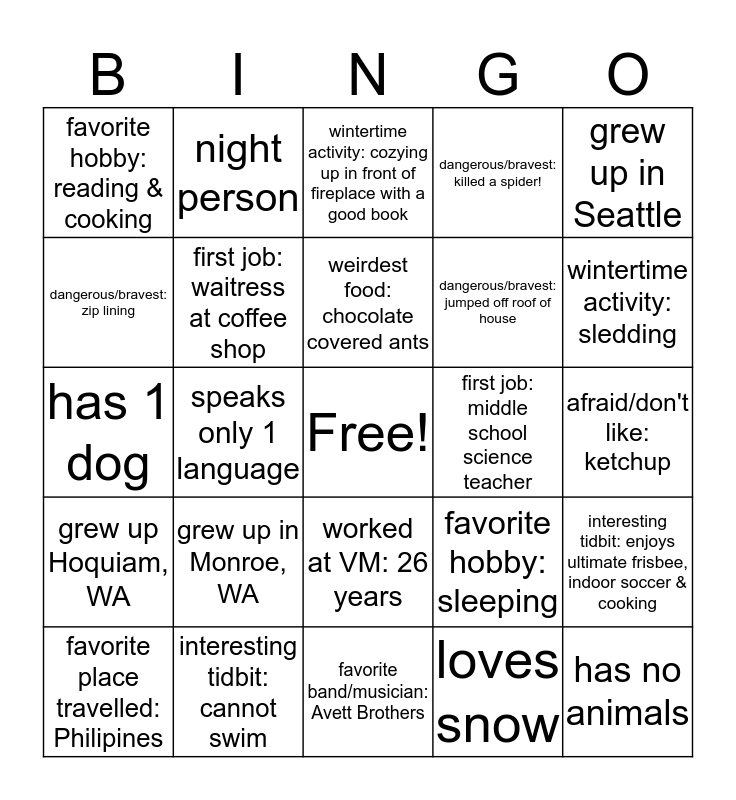 This bingo card has a free space and 25 words: grew up in Monroe, WA, favorite band/musician: Avett Brothers, weirdest food: chocolate covered ants, favorite place travelled: Philipines, grew up in Seattle, favorite hobby: reading & cooking, dangerous/bravest: zip lining, night person, first job: middle school science teacher, worked at VM: 26 years, dangerous/bravest: jumped off roof of house, has 1 dog, favorite hobby: sleeping, interesting tidbit: enjoys ultimate frisbee, indoor soccer & cooking, first job: waitress at coffee shop, favorite show: Greys Anatomy, afraid/don't like: ketchup, wintertime activity: cozying up in front of fireplace with a good book, wintertime activity: sledding, speaks only 1 language, has no animals, interesting tidbit: cannot swim, grew up Hoquiam, WA, dangerous/bravest: killed a spider! and loves snow.