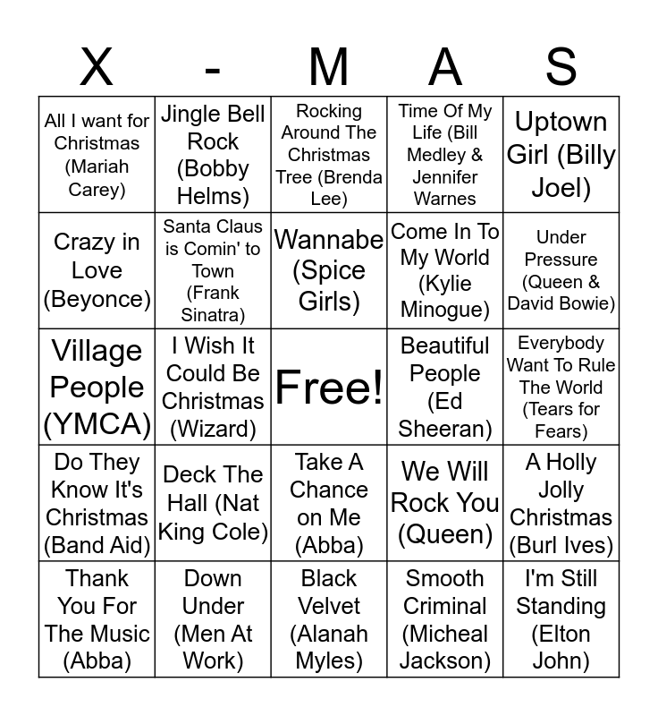 This bingo card has a free space and 27 words: We Will Rock You (Queen), Only Girl in The world (Rihanna), Come In To My World (Kylie Minogue), Black Velvet (Alanah Myles), Crazy in Love (Beyonce), Rocking Around The Christmas Tree (Brenda Lee), Jingle Bell Rock (Bobby Helms), Do They Know It's Christmas (Band Aid), Beautiful People (Ed Sheeran), A Holly Jolly Christmas (Burl Ives), Village People (YMCA), Time Of My Life (Bill Medley & Jennifer Warnes, Thank You For The Music (Abba), Down Under (Men At Work), Under Pressure (Queen & David Bowie), Uptown Girl (Billy Joel), Santa Claus is Comin' to Town (Frank Sinatra), Wannabe (Spice Girls), Deck The Hall (Nat King Cole), All I want for Christmas (Mariah Carey), Everybody Want To Rule The World (Tears for Fears), Smooth Criminal (Micheal Jackson), I Wish It Could Be Christmas (Wizard), I'm Still Standing (Elton John), Take A Chance on Me (Abba), Uptown Girl (Billy Joel) and It's The Most Wonderful Time of The Year (Andy Wiliams).