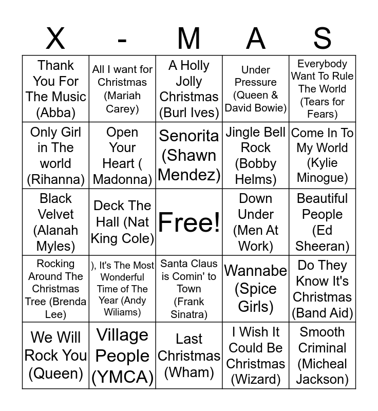 This bingo card has a free space and 24 words: ), It's The Most Wonderful Time of The Year (Andy Wiliams), Village People (YMCA), Senorita (Shawn Mendez), We Will Rock You (Queen), Everybody Want To Rule The World (Tears for Fears), Thank You For The Music (Abba), Only Girl in The world (Rihanna), All I want for Christmas (Mariah Carey), Down Under (Men At Work), Santa Claus is Comin' to Town (Frank Sinatra), Jingle Bell Rock (Bobby Helms), Black Velvet (Alanah Myles), Wannabe (Spice Girls), Do They Know It's Christmas (Band Aid), Open Your Heart ( Madonna), I Wish It Could Be Christmas (Wizard), Beautiful People (Ed Sheeran), A Holly Jolly Christmas (Burl Ives), Come In To My World (Kylie Minogue), Deck The Hall (Nat King Cole), Smooth Criminal (Micheal Jackson), Rocking Around The Christmas Tree (Brenda Lee), Under Pressure (Queen & David Bowie) and Last Christmas (Wham).