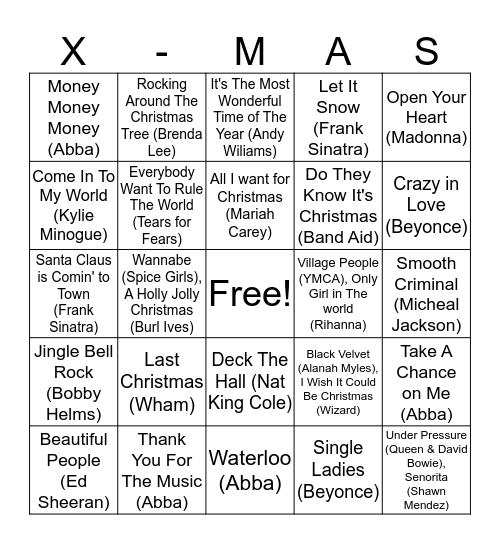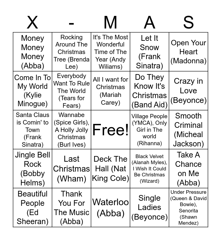 This bingo card has a free space and 25 words: Last Christmas (Wham), Waterloo (Abba), All I want for Christmas (Mariah Carey), Beautiful People (Ed Sheeran), Open Your Heart (Madonna), Money Money Money (Abba), Come In To My World (Kylie Minogue), Rocking Around The Christmas Tree (Brenda Lee), Village People (YMCA), Only Girl in The world (Rihanna), Deck The Hall (Nat King Cole), Do They Know It's Christmas (Band Aid), Santa Claus is Comin' to Town (Frank Sinatra), Black Velvet (Alanah Myles), I Wish It Could Be Christmas (Wizard), Take A Chance on Me (Abba), Everybody Want To Rule The World (Tears for Fears), We Will Rock You (Queen), Down Under (Men At Work), Smooth Criminal (Micheal Jackson), It's The Most Wonderful Time of The Year (Andy Wiliams), Crazy in Love (Beyonce), Wannabe (Spice Girls), A Holly Jolly Christmas (Burl Ives), Under Pressure (Queen & David Bowie), Senorita (Shawn Mendez), Thank You For The Music (Abba), Jingle Bell Rock (Bobby Helms), Let It Snow (Frank Sinatra) and Single Ladies (Beyonce).
