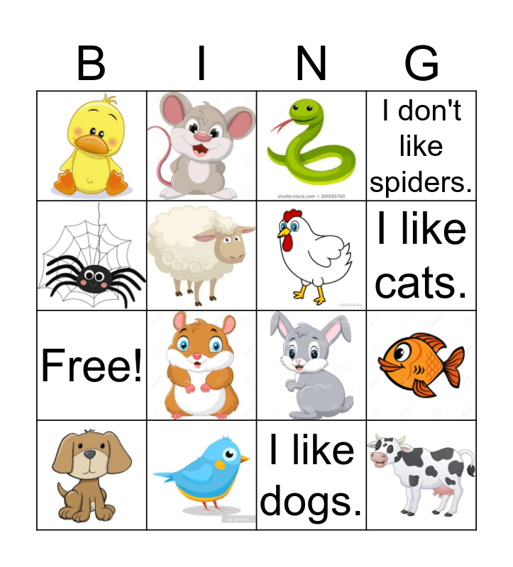 This bingo card has 16 images and 4 words: Free!, I like cats., I don't like spiders. and I like dogs..