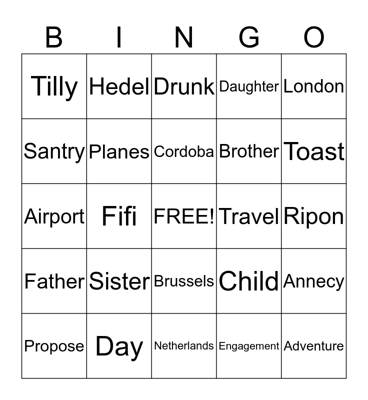 This bingo card has a free space and 63 words: Allianz, Alfa, Romeo, Annecy, Dublin, Maarheeze, Hedel, Rosmalen, Cordoba, Gdansk, Brussels, Harrogate, Ripon, London, Garristown, Santry, Fifi, Tilly, Guinness, Brother, Sister, Father, Daughter, Mother, Family, Friends, School, Beer, Food, Amazing, Beautiful, Rain, Sun, Drink, Toast, Propose, Wedding, Engagement, Cars, Planes, Airport, Travel, Backpack, Trip, Adventure, Day, Children, Child, Grandchildren, Babies, Ireland, Netherlands, Job, Fun, Join, Drunk, Those who have travelled to be with us today…, I am so proud!, I remember when!, I feel very honoured, I'm going to keep this short, Where do I begin? and Special thank you to!.