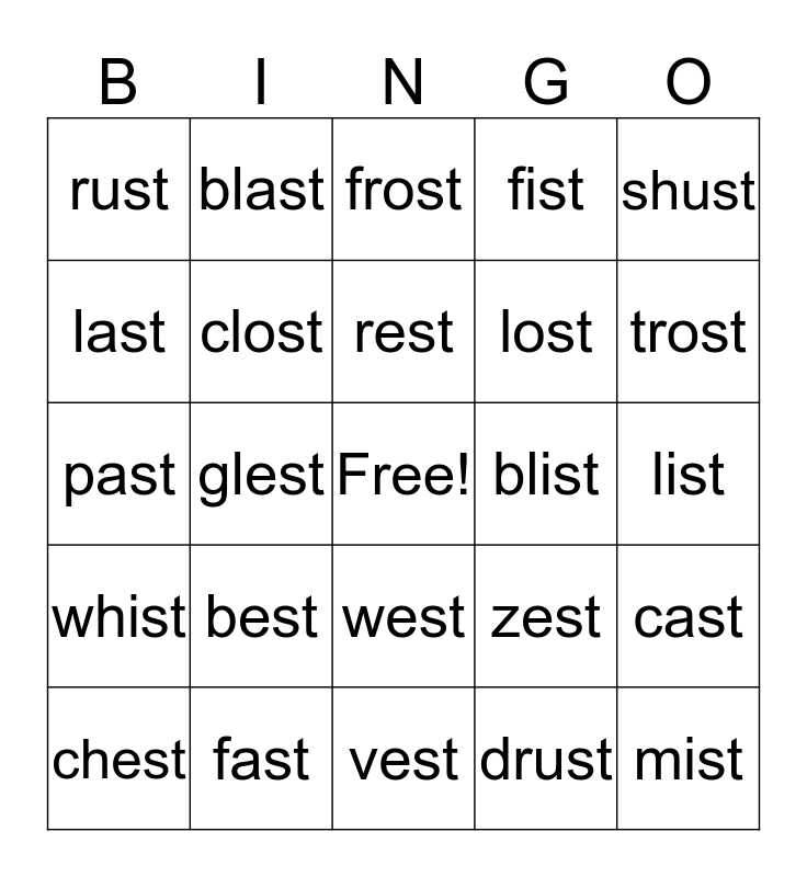 This bingo card has a free space and 24 words: best, fast, rest, chest, shust, rust, last, blast, blist, west, lost, past, zest, cast, clost, drust, list, frost, trost, glest, mist, whist, fist and vest.