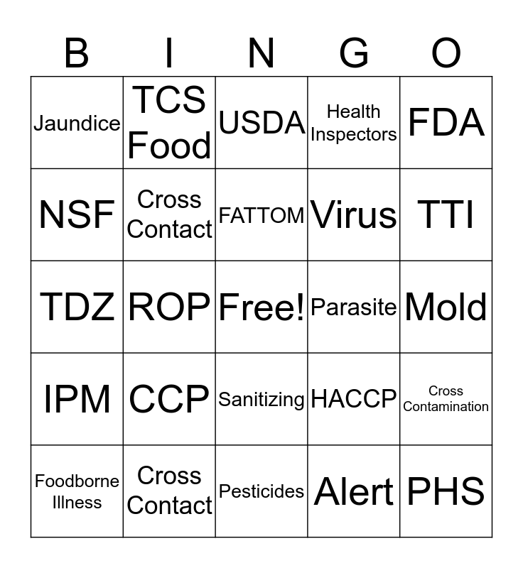 This bingo card has a free space and 24 words: CCP, Cross Contact, FATTOM, Foodborne Illness, FDA, Jaundice, NSF, TCS Food, Parasite, Sanitizing, Virus, TDZ, HACCP, Cross Contamination, Cross Contact, Alert, Mold, USDA, TTI, ROP, PHS, IPM, Health Inspectors and Pesticides.