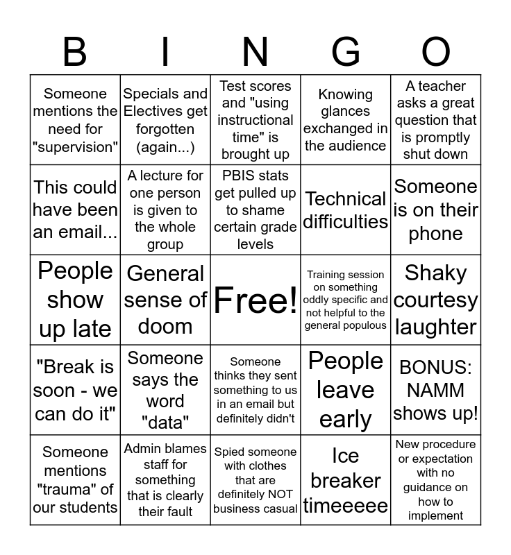 This bingo card has a free space and 24 words: Someone says the word "data", Admin blames staff for something that is clearly their fault, PBIS stats get pulled up to shame certain grade levels, Someone mentions "trauma" of our students, A teacher asks a great question that is promptly shut down, Someone mentions the need for "supervision", This could have been an email..., Specials and Electives get forgotten (again...), Training session on something oddly specific and not helpful to the general populous, Someone thinks they sent something to us in an email but definitely didn't, Technical difficulties, People show up late, People leave early, BONUS: NAMM shows up!, A lecture for one person is given to the whole group, Ice breaker timeeeee, Shaky courtesy laughter, Test scores and "using instructional time" is brought up, Someone is on their phone, General sense of doom, New procedure or expectation with no guidance on how to implement, "Break is soon - we can do it", Knowing glances exchanged in the audience and Spied someone with clothes that are definitely NOT business casual.