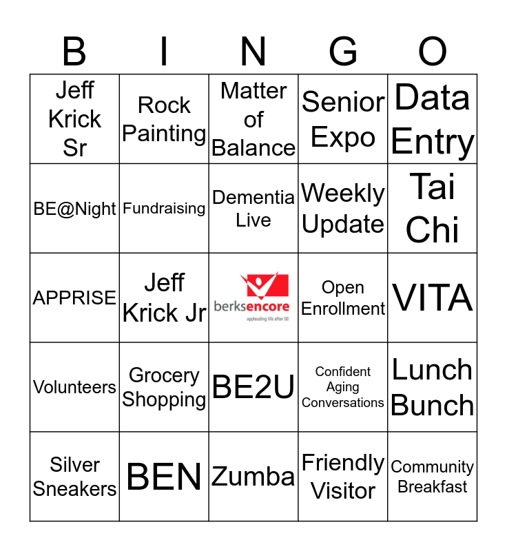 This bingo card has a free space and 41 words: Meals on Wheels, APPRISE, Walk with Ease, Fundraising, BEN, BE2U, Dementia Live, Pound Class, Data Entry, Volunteers, Jeff Krick Jr, Senior Expo, Community Breakfast, VITA, Open Enrollment, Grocery Shopping, Fun Committee, Jeff Krick Sr, Subaru, Matter of Balance, Lunch Bunch, Chair Yoga, Zumba, Weekly Update, Rock Painting, Karaoke, Friendly Visitor, Chorus, Tai Chi, Change of Condition, Healthy Steps in Motion, Rock Painting, Silver Sneakers, Raiser's Edge, Confident Aging Conversations, BE@Night, Business Development, United Way, Area Agency on Aging, Prospectus Berco and Neag Center for Senior Services.