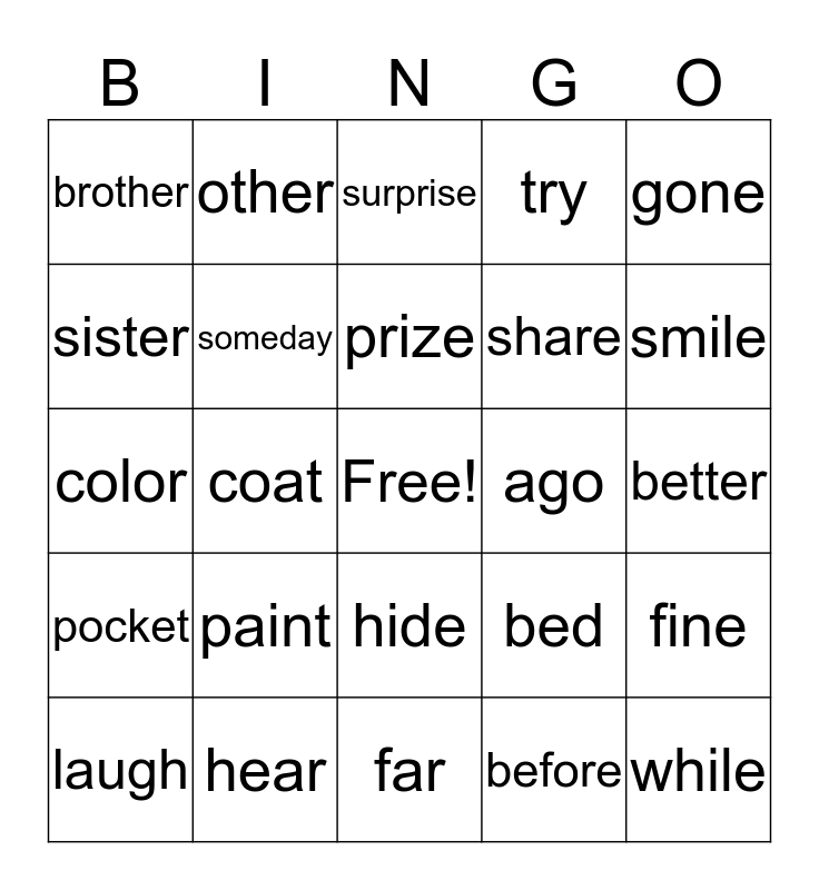 This bingo card has a free space and 29 words: laugh, about, coat, ten, brother, surprise, someday, paint, ago, hear, better, while, far, before, smile, store, hide, pocket, gone, color, bed, year, share, sister, try, other, fine, prize and next.