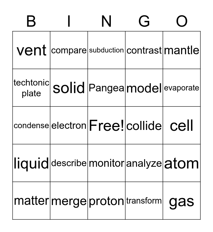 This bingo card has a free space and 29 words: converge, merge, subduction, magma, mantle, vent, solid, Pangea, collide, atom, matter, electron, transform, gas, condense, hypothesis, proton, analyze, evaporate, liquid, describe, examine, model, cell, techtonic plate, compare, monitor, contrast and elements.