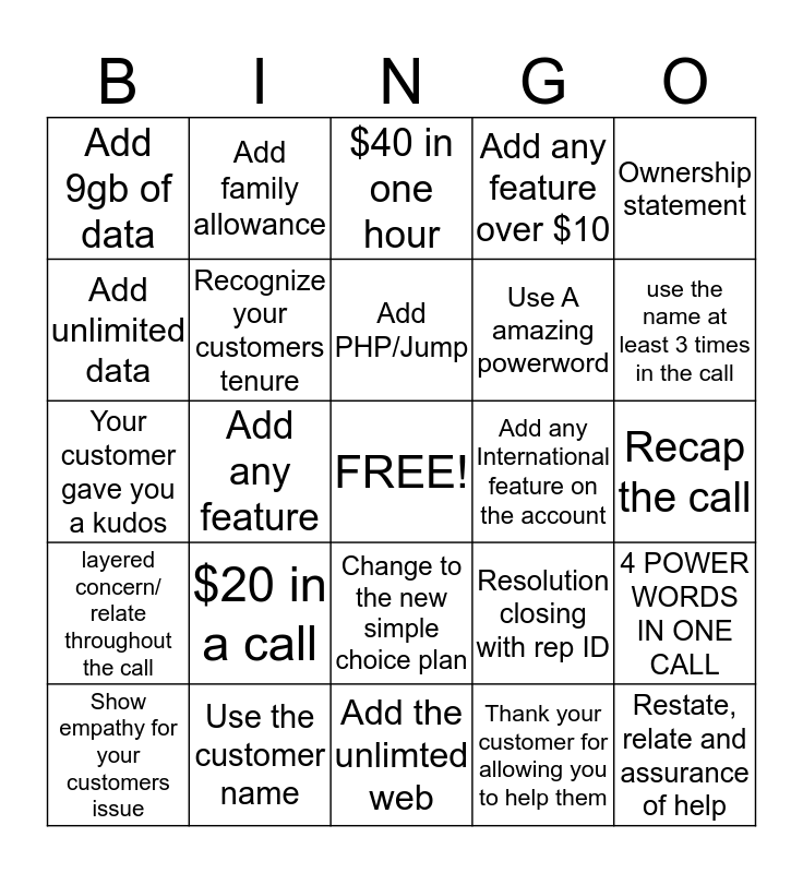 This bingo card has a free space and 24 words: $20 in a call, Use the customer name, Add PHP/Jump, Show empathy for your customers issue, Ownership statement, Add 9gb of data, Add unlimited data, Add family allowance, Add any International feature on the account, Change to the new simple choice plan, Use A amazing powerword, Your customer gave you a kudos, Resolution closing with rep ID, 4 POWER WORDS IN ONE CALL, Recognize your customers tenure, Thank your customer for allowing you to help them, Recap the call, $40 in one hour, use the name at least 3 times in the call, Add any feature, Restate, relate and assurance of help, layered concern/ relate throughout the call, Add any feature over $10 and Add the unlimted web.