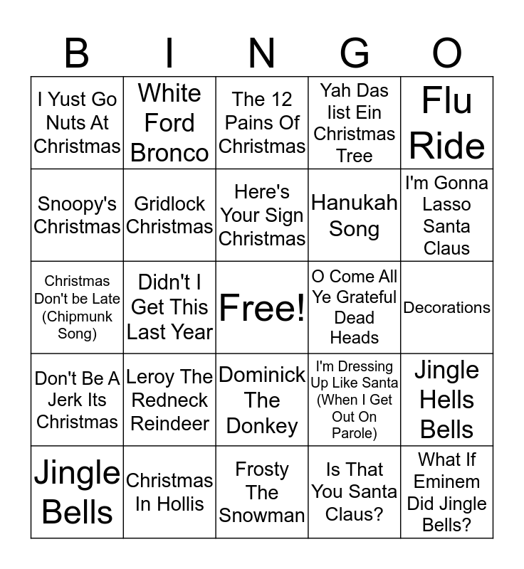 This bingo card has a free space and 79 words: Little Saint Nick, Run Rudolph Run, The 12 Pains Of Christmas, There's Another Santa Claus, Walkin' Round In Women's Underwear, I Am Santa Claus, The Chimney Song, We Wish You Weren't Living With Us, Wreck The Malls, The Restroom Door Said gentleman, Nuttin' For Christmas, The Hat I Got For Christmas Is To Beeg, Yah Das Iist Ein Christmas Tree, I Yust Go Nuts At Christmas, The Man With All The Toys, Snoopy's Christmas, Redneck 12 Days Of Christmas, Leroy The Redneck Reindeer, Who Put The Stump?, Decorations, Goin' Up To Bethlehem, Flu Ride, Christmas Don't be Late (Chipmunk Song), Here's Your Sign Christmas, Gridlock Christmas, Ghost Reindeer In The Sky, Mr. Santa, Santa's Beard, I Tan't Wait Till Quithmuth Day, Randolph The Flat Nosed Reindeer, I'm Gonna Lasso Santa Claus, Santa Claus Is Watching You, Frosty The Snowman, Ornaments, Jingle Bells, O Come All Ye Grateful Dead Heads, Santa & The Satellite, Rusty Chevrolet, Be Claus I GOt High, What If Eminem Did Jingle Bells?, Have Yourself an Ozzy Little Christmas, Shoppin' Around For A Christmas Tree, Carol Of The Bartenders, Christmas Money (That's What I Want ), G'Bye Ding A Ling, White Ford Bronco, Grampa Loved The Rolling Stones, O Little Town Of Bethlehem, I Came Upopn A Roadkill Deer, Teddy The Red Nosed Senator, Jingle Hells Bells, Didn't I Get This Last Year, I'm Dressing Up Like Santa (When I Get Out On Parole), Grandma Got Run Over By A Reindeer, Grandpa's Gonna Sue The Pants Off Santa, All I Want For Christmas Is My 2 Front Teeth, I Want A Hippopotamus For Christmas, Three Inch Tool, Middle Age Waistline, Dominick The Donkey, Hanukah Song, O Holy Night (Erik Cartman), Just Another Christmas Song, Here Comes Bubba Claus, Egg Nogg Boogie, Barking Jungle Bells, Me & Mrs. Claus, I'll Be Stoned For Christmas, Santa Claus is Foolin' Around, Don't Be AJerk Its Christmas, Christmas In Hollis, All I Want FOr Christmas Is A Real Good Tan, The Christmas Can Can, Even Santa Needs A Break Sometimes, Honky Tonk Christmas, Is That You Santa Claus?, Chipmunks Roasting On An Open Fire, Holy S*** It's Christmas and Present Face.