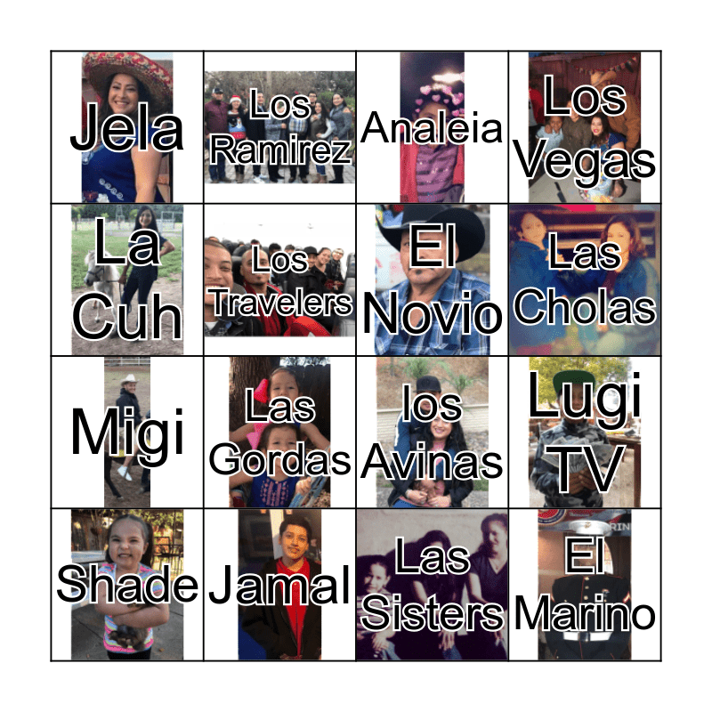This bingo card has 20 images and 20 words: Lugi TV, los chemas, Analeia, La Cool Tia, Shade, La Cuh, Jamal, Jela, Migi, Los Ramirez, Las Gordas, los Avinas, Los Travelers, El Marino, El Novio, Mama Gloria, Las Cholas, Los Vegas, Las Sisters and Danny Boy.