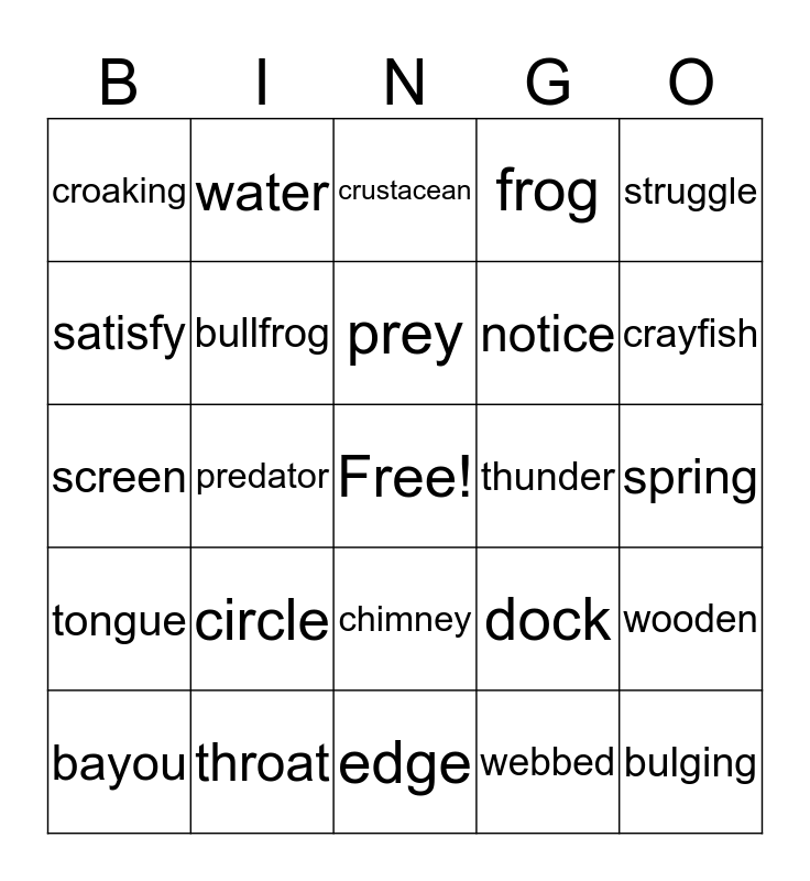 This bingo card has a free space and 29 words: bayou, diet, predator, life cycle, croaking, crustacean, bullfrog, circle, thunder, throat, spring, bulging, edge, webbed, crayfish, emerge, chimney, tongue, struggle, screen, dock, evening, notice, satisfy, frog, water, wooden, prey and retreat.