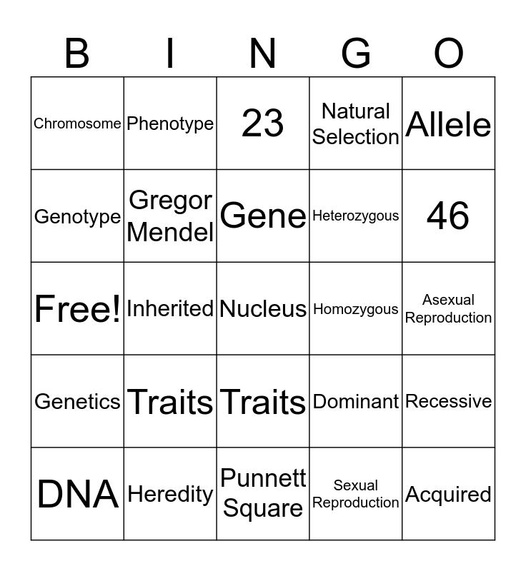 This bingo card has a free space and 24 words: Traits, Heredity, Gene, DNA, Allele, Chromosome, Genotype, Phenotype, Homozygous, Traits, Heterozygous, Free!, Dominant, Recessive, Gregor Mendel, Sexual Reproduction, Asexual Reproduction, 23, 46, Inherited, Acquired, Genetics, Natural Selection and Punnett Square.