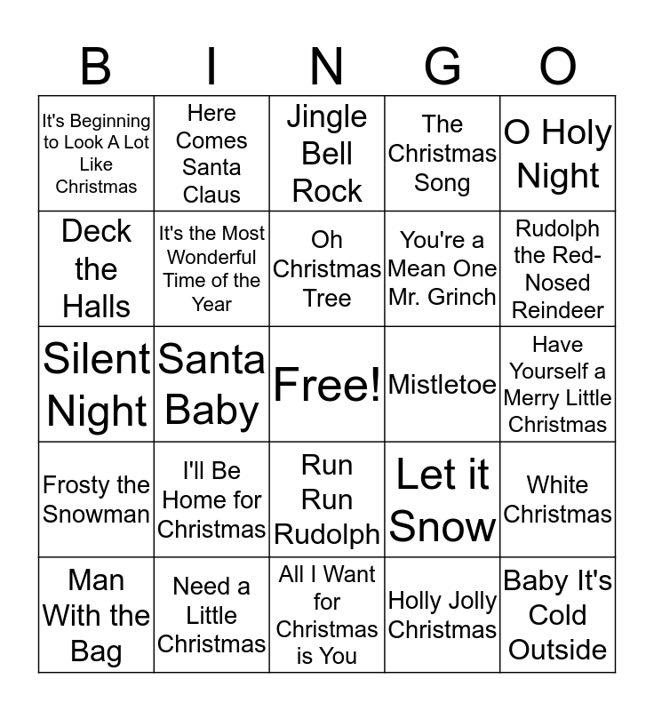 This bingo card has a free space and 31 words: All I Want for Christmas is You, Last Christmas, Santa Baby, Rockin Around the Christmas Tree, It's Beginning to Look A Lot Like Christmas, Jingle Bell Rock, It's the Most Wonderful Time of the Year, Let it Snow, Mistletoe, Holly Jolly Christmas, Have Yourself a Merry Little Christmas, Baby It's Cold Outside, Santa Claus is Coming to Town, Winter Wonderland, Rudolph the Red-Nosed Reindeer, I Saw Mommy Kissing Santa Claus, White Christmas, I'll Be Home for Christmas, Frosty the Snowman, Run Run Rudolph, O Holy Night, Joy to the World, Man With the Bag, Here Comes Santa Claus, You're a Mean One Mr. Grinch, Deck the Halls, The Christmas Song, Silent Night, Need a Little Christmas, Oh Christmas Tree and Jolly Old St Nicholas.