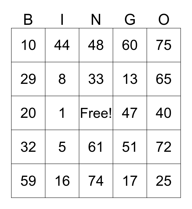 This bingo card has a free space and 24 words: 5, 16, 33, 59, 75, 10, 29, 44, 47, 61, 13, 20, 51, 72, 8, 17, 40, 48, 65, 1, 25, 32, 60 and 74.